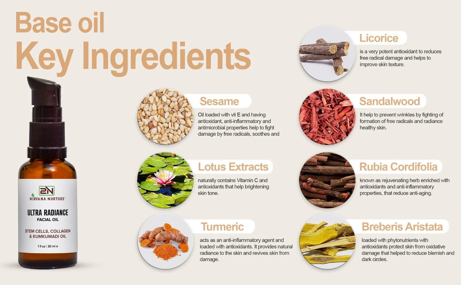 ULTRA RADIANCE GLOW FACE OIL : Nirvana Nurture Ultra Radiance Glow Face Oil is a luxurious facial oil formulated with over 30 premium-grade active ingredients. Inspired by ancient Ayurvedic traditions and infused with Kumkumadi Tailam, this lightweight oil helps enhance skin radiance, improve the appearance of dull skin, and provide long-lasting moisture.
