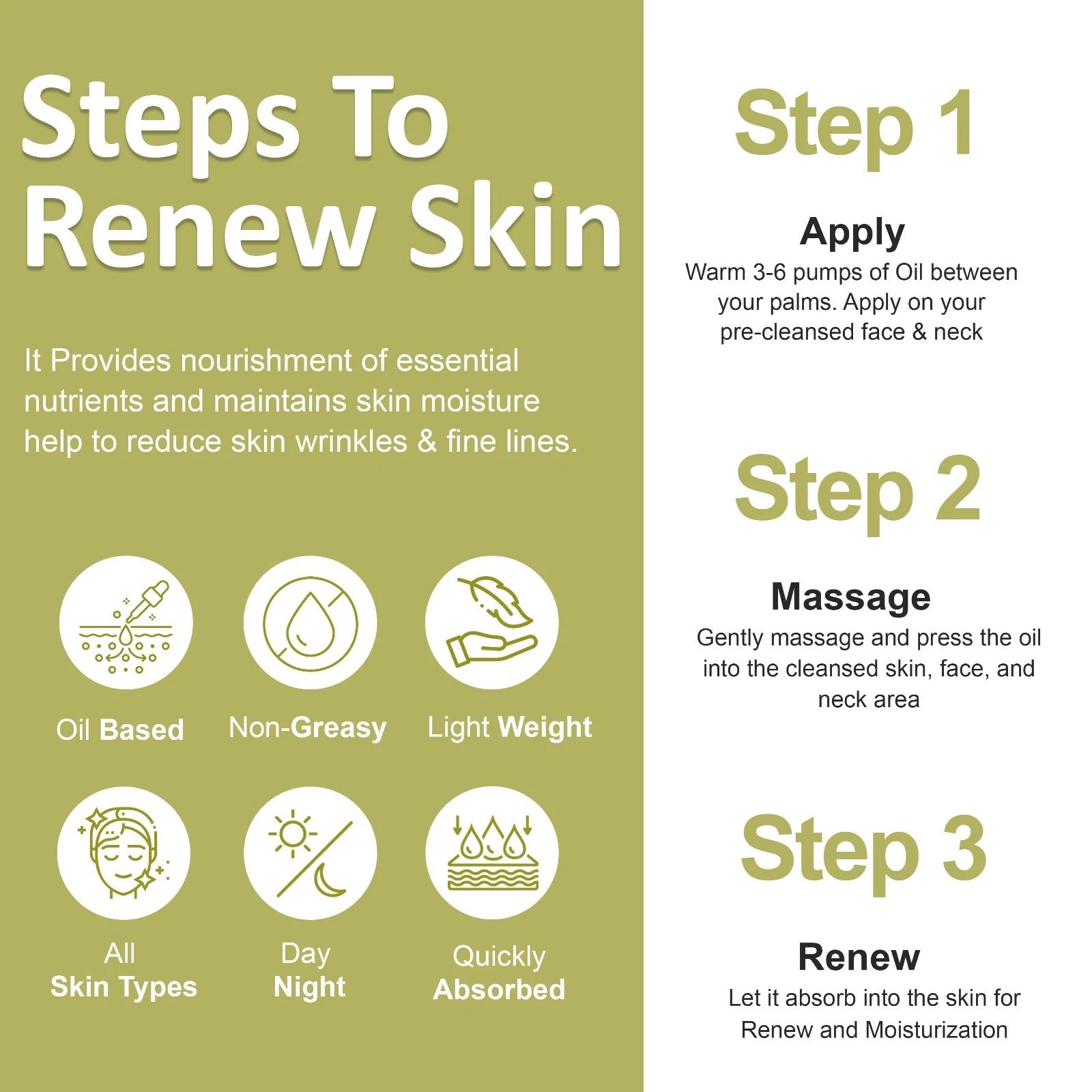 Suitable for all skin types. Warm 3–6 pumps of Ultra Renew Age-Defying Facial Oil between your palms. Gently smooth and press onto cleansed skin over the face and neck. Allow the oil to fully absorb. For best results, use morning and evening. The lightweight, non-greasy formula absorbs easily into the skin.