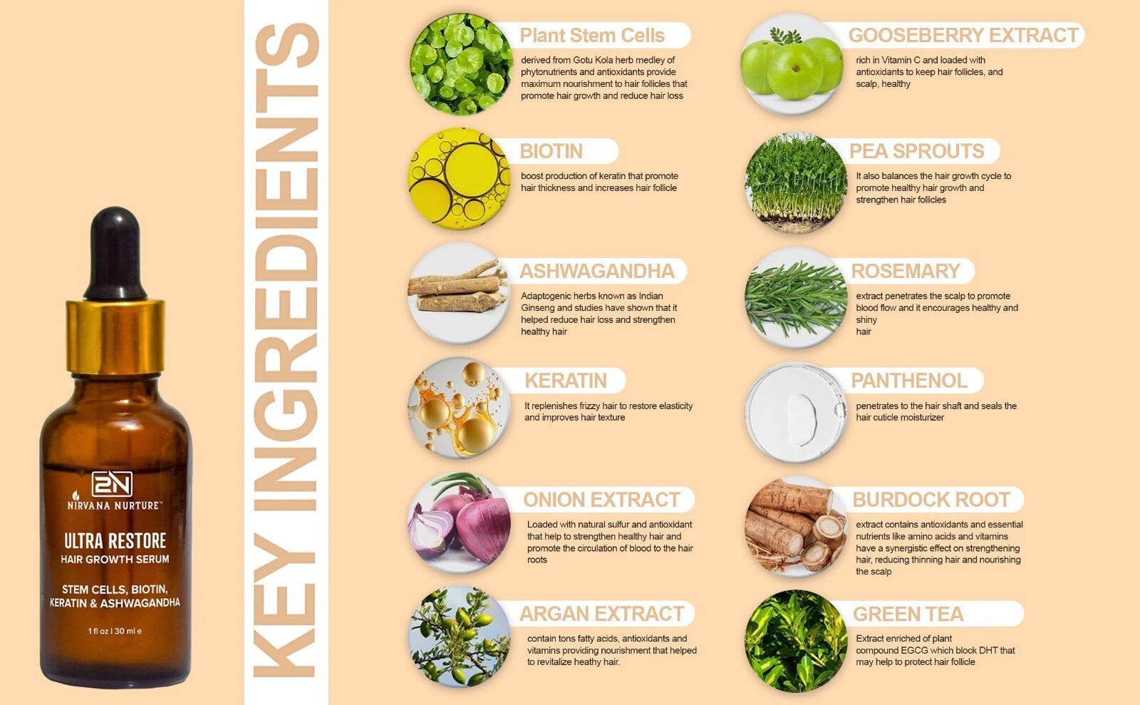Ultra-Restore Hair Serum combines plant stem cell extracts, biotin, keratin, ashwagandha, amino acids, collagen, niacinamide, vitamins, onion extract, argan oil, and turmeric. These ingredients work together to support scalp balance, reduce breakage, smooth frizz, and improve hair texture and manageability.